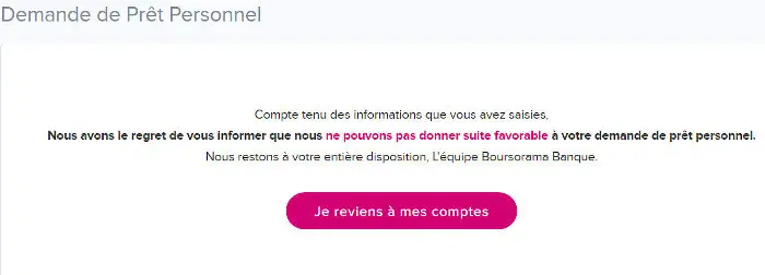 « Compte tenu des informations que vous avez saisies, nous avons le regret de vous informer que nous ne pouvons pas donner suite favorable à votre demande de prêt personnel. Nous restons à votre entière disposition, L’équipe Boursorama Banque. »