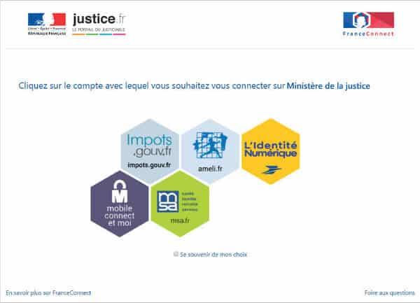 - Étape 2 : pour consulter son dossier de façon sécurisée, il s’identifie ensuite via France Connect. Grâce à ce dispositif, il n’a pas besoin de créer un nouveau compte. Il peut utiliser les identifiants d’un compte qu’il a déjà, impôts.gouv.fr par exemple. Il ne lui reste plus qu’à cliquer sur l’icône ministère de la justice.