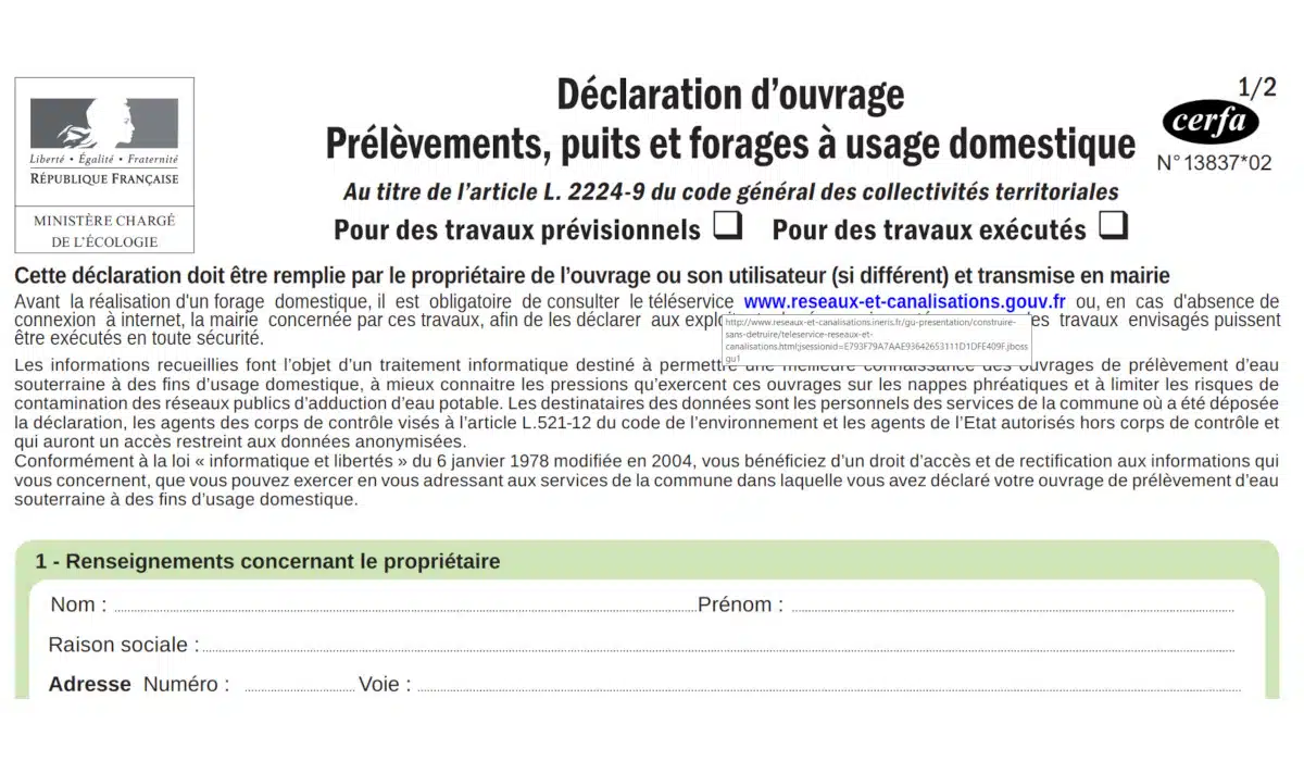 Le formulaire Cerfa 13837*02 est utilisé pour déclarer un ouvrage de prélèvement d’eau souterraine à un usage domestique (réservé exclusivement à la satisfaction des besoins des propriétaires et locataires). Une fois complété et signé, il est à envoyer à la mairie du lieu du projet avec les pièces justificatives. Le Cerfa 13837*02 est découpé en huit parties :