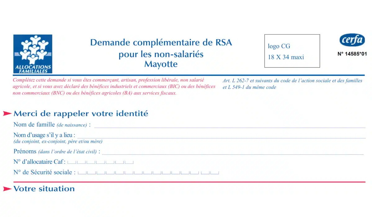 Le formulaire CERFA 14585*01 permet aux non-salariés de faire une demande complémentaire de RSA à Mayotte. Une fois complété et signé, il est à transmettre à Caisse nationale des allocations familiales (Cnaf) de Mayotte (voir l’adresse ci-dessous). Le CERFA 14585*01 est découpé en sept parties :