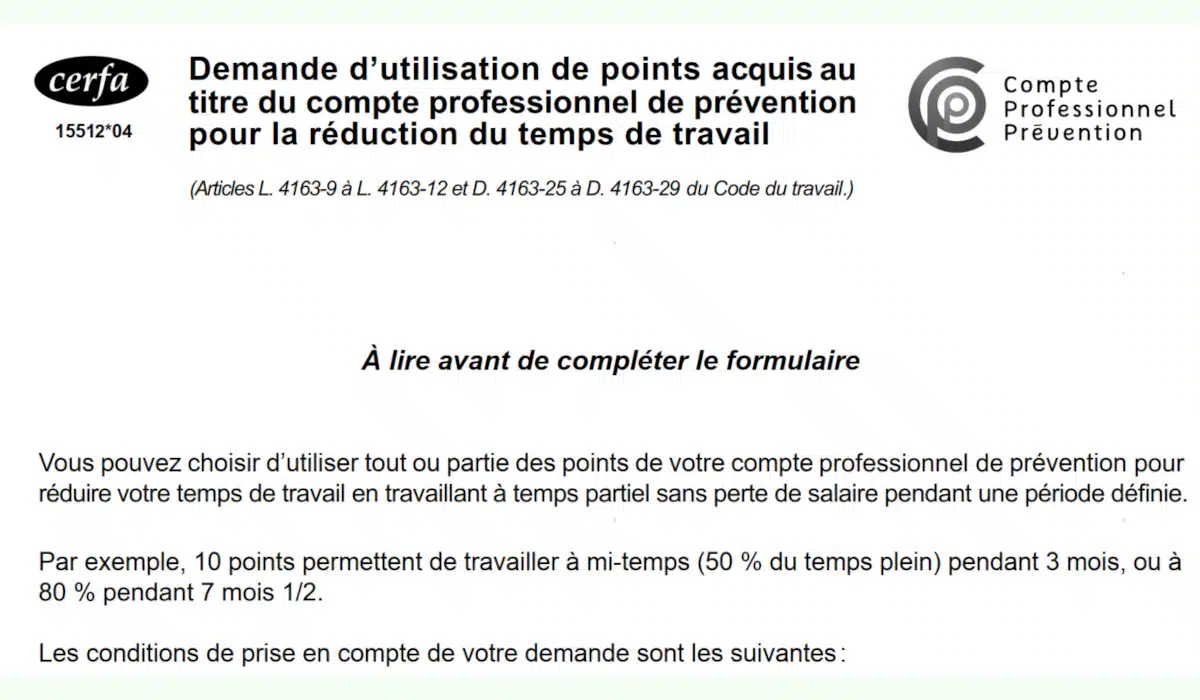 Télécharger le formulaire Cerfa 15512*04 pour demander l’utilisation de points acquis pour la réduction du temps de travail :