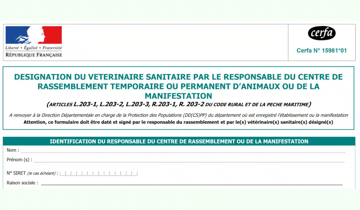 Le formulaire Cerfa 15881*01 est utilisé pour désigner le vétérinaire sanitaire par le responsable du centre de rassemblement temporaire ou permanent d’animaux ou de la manifestation. Une fois complété et signé, il est à envoyer à la Direction Départementale en charge de la Protection des Populations (DD(CS)PP) du département où est enregistré l’établissement ou la manifestation. Le Cerfa 15881*01 est découpé en trois parties :