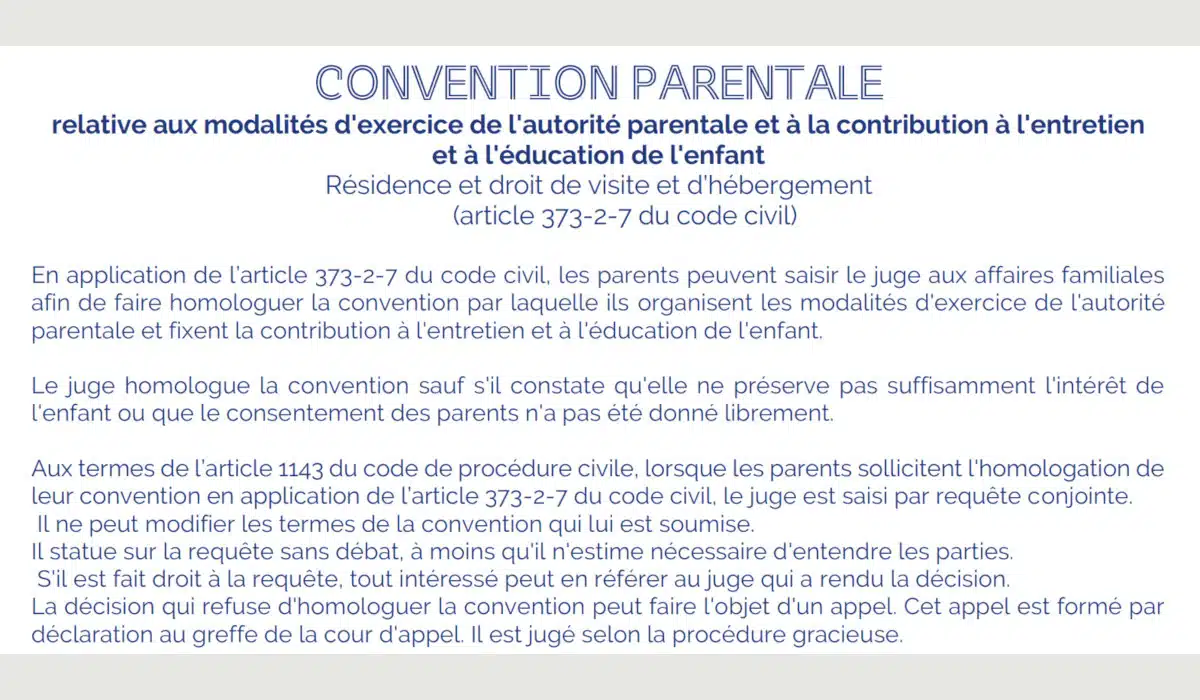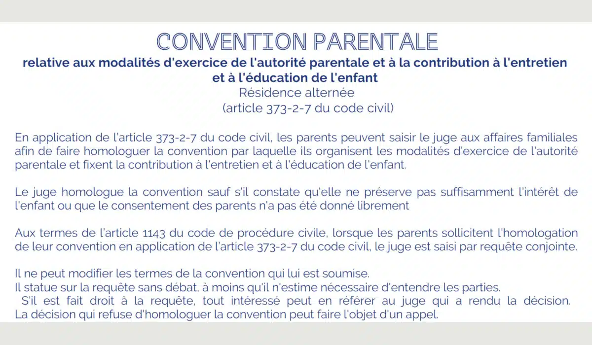 La convention parentale de résidence alternée est utilisée pour définir les modalités d’exercice de l’autorité parentale et à la contribution à l’entretien et à l’éducation de l’enfant en application de l’article 373-2-7 du Code civil. Une fois complété et signé, il est à envoyer au juge aux affaires familiales dont vous dépendez (selon l’adresse de votre domicile) pour homologation avec les pièces justificatives. La convention est découpée en sept parties :
