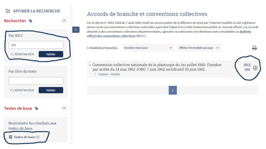 - Tapez le numéro IDCC : par exemple « 292 » pour la convention collective de la « Plasturgie »,