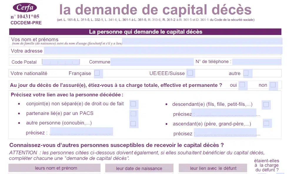 Bénéficiaire prioritaire du capital décès, je vous prie de bien vouloir trouver ci-joint le formulaire Cerfa n°10431*05 complété.