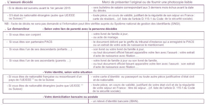 - Ou, au jour du décès, en maintien de droit à l’assurance décès au titre de l’une des situations citées ci-dessus (salarié, chômeur, etc.) (cf. article L.161-8 du Code de la sécurité sociale).