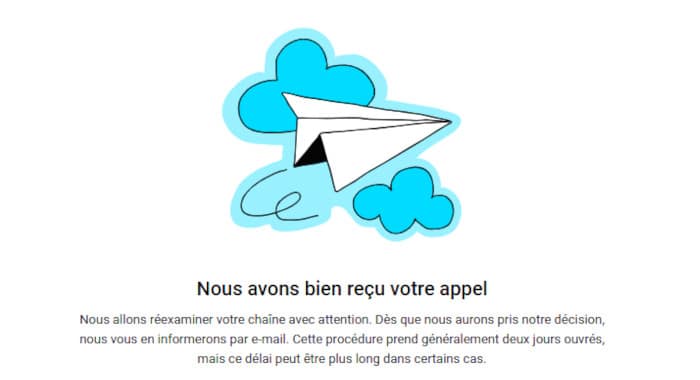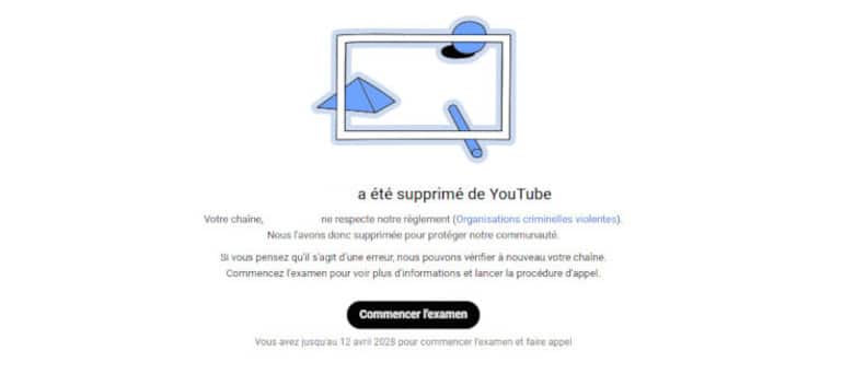 YouTube vous rappelle que votre chaîne a bien été supprimée et la date jusqu’à laquelle vous pouvez faire appel. Vous avez jusqu’à cinq ans pour faire appel à compter de la date de suppression.