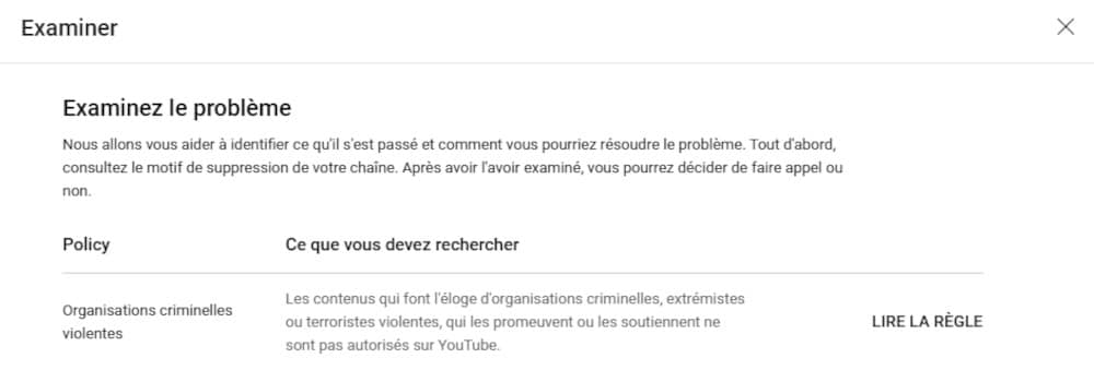 YouTube propose d’accéder via un bouton à la lecture des règles et des politiques (contenu, copyright, spam, comportement trompeur, etc.). Il doit vous permettre de comprendre les raisons de la suppression de la chaîne et de trouver les arguments pour son rétablissement.