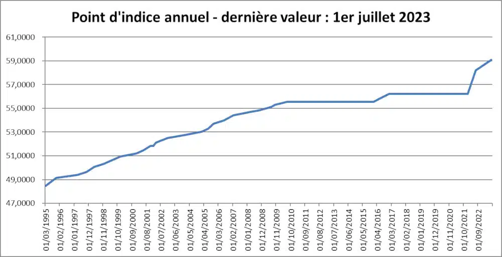 Bonjour, oui, le gouvernement a décidé une augmentation de +3,5 % du point d’indice des fonctionnaires et de grandes entreprises privée pour essayer de compenser l’inflation galopante dans le pays. La dernière valeur du point d’indice est désormais 58,2005, soit 4,850042 par mois au 1er juillet 2022. Nous allons mettre à jour notre article et le graphique pour en tenir compte. Cordialement