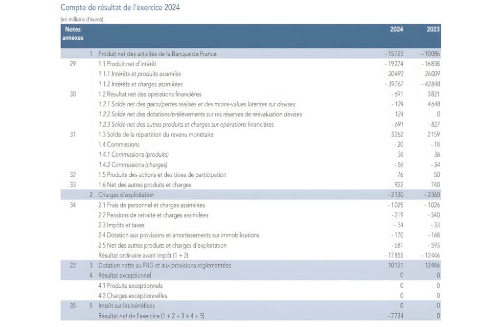 Les fonds propres de la Banque de France sont en diminution constante depuis 2019. Il en va de même du résultat net et qui est pour la première fois négatif (-7 734 milliards) en 2024.