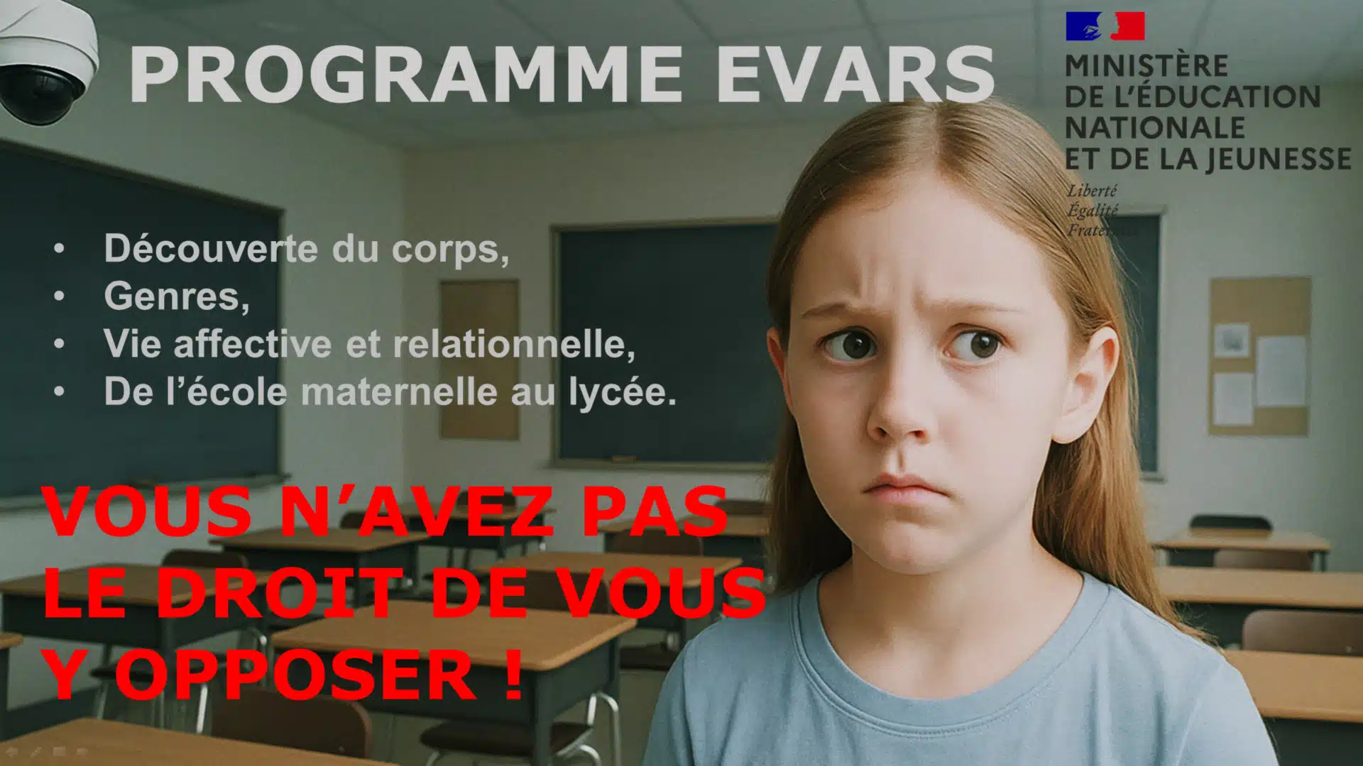 Le programme « EVARS », élaboré par l’Éducation nationale, est l’acronyme de « Éducation à la Vie Affective, Relationnelle et Sentimentale ». Il s’adresse aux élèves de l’école maternelle jusqu’au lycée et porte sur l’éducation à la vie affective et relationnelle et la Sxlté. Le programme EVARS a été publié au Journal officiel le 5 février 2025 par Elisabeth Borne (encore elle !). Il entrera en application en septembre prochain pour la rentrée scolaire 2025-2026.