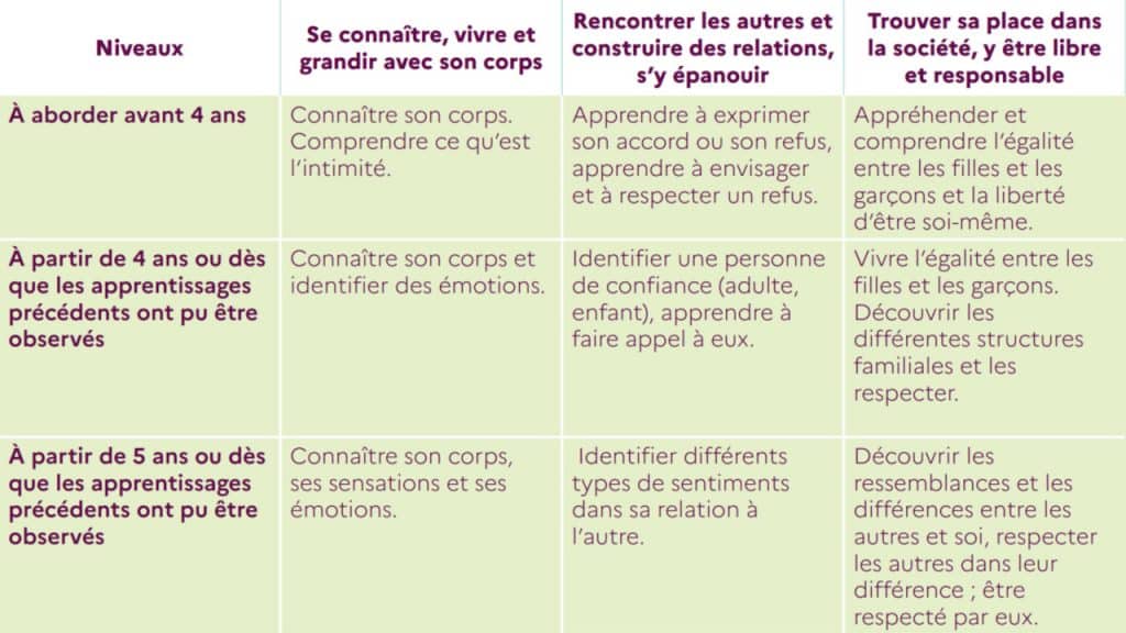 Dès la petite section, avant même l’âge de 4 ans, les enfants sont introduits à des notions sensibles telles que :