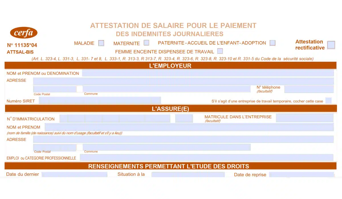 Attention, pour une demande d’attestation d’Ameli (le site français d’assurance maladie en ligne) pour le paiement des indemnités journalières, vous devez utiliser le formulaire Cerfa 11135-04 Ameli. Le document est à faire compléter et signer par l’employeur.