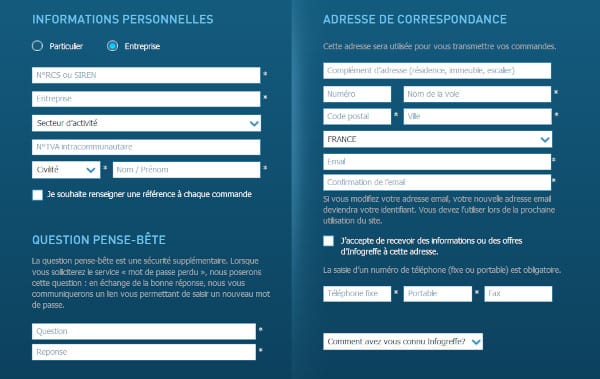 Nous vous recommandons de prendre l’option gratuite, s’il s’agit de commander des Kbis ou de faire des déclarations d’actes juridiques. Vous accédez alors à la fiche signalétique de création du compte.