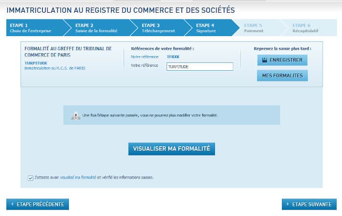 À noter qu’à tout moment, il est possible de sauvegarder votre dossier sous la désignation de votre choix et de le reprendre pour le compléter dans l’onglet « mes formalités« .