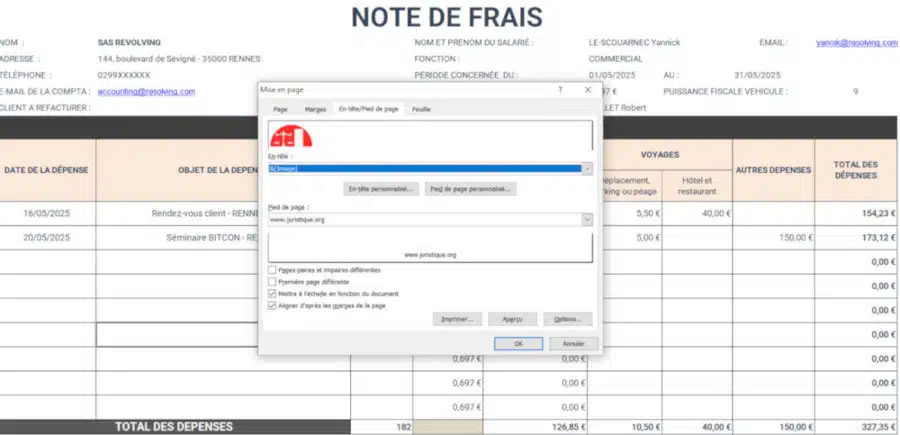 - Mise en Page : définition d’une zone d’impression dans le menu « Mise en page », puis « Feuille », centrée verticalement et horizontalement et avec des marges de 1,5 cm. Ainsi, seule la zone de note de frais est imprimée.