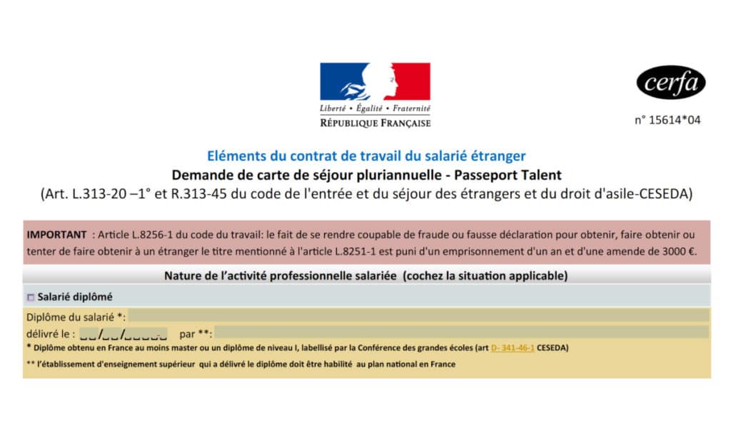 Le formulaire CERFA 15614*04 est utilisé pour une carte de séjour pluriannuelle d’un étranger en France avec le passeport talent. La procédure s’adresse principalement aux …