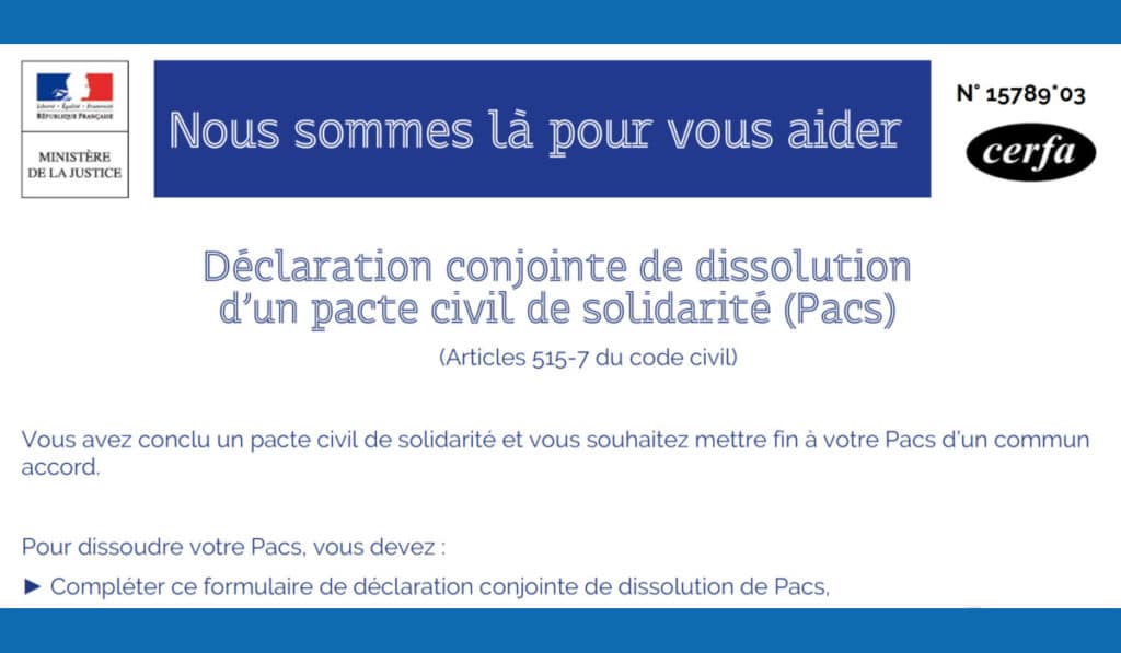 Le formulaire Cerfa 15789*03 est utilisé pour une déclaration conjointe de dissolution d’un Pacs. Une fois complété et signé, il est à remettre à l’officier …