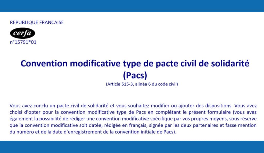 Le formulaire Cerfa 15790*02 est utilisé pour modifier un contrat de Pacs ou ajouter de nouvelles dispositions. Une fois complété et signé, il est à …
