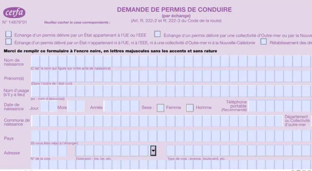 Le formulaire Cerfa 14879*01 est utilisé pour une demande de permis de conduire par échange. Une fois complété et signé, il est à envoyer à …