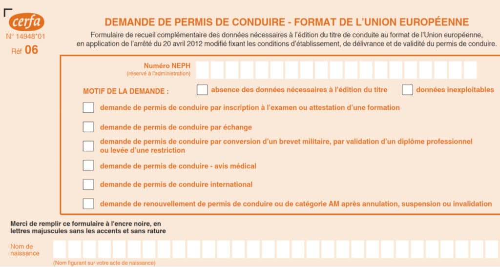 Le formulaire Cerfa 14882*01 est utilisé pour une demande de renouvellement du permis de conduire, de duplicata ou de catégorie AM après annulation, suspension ou …